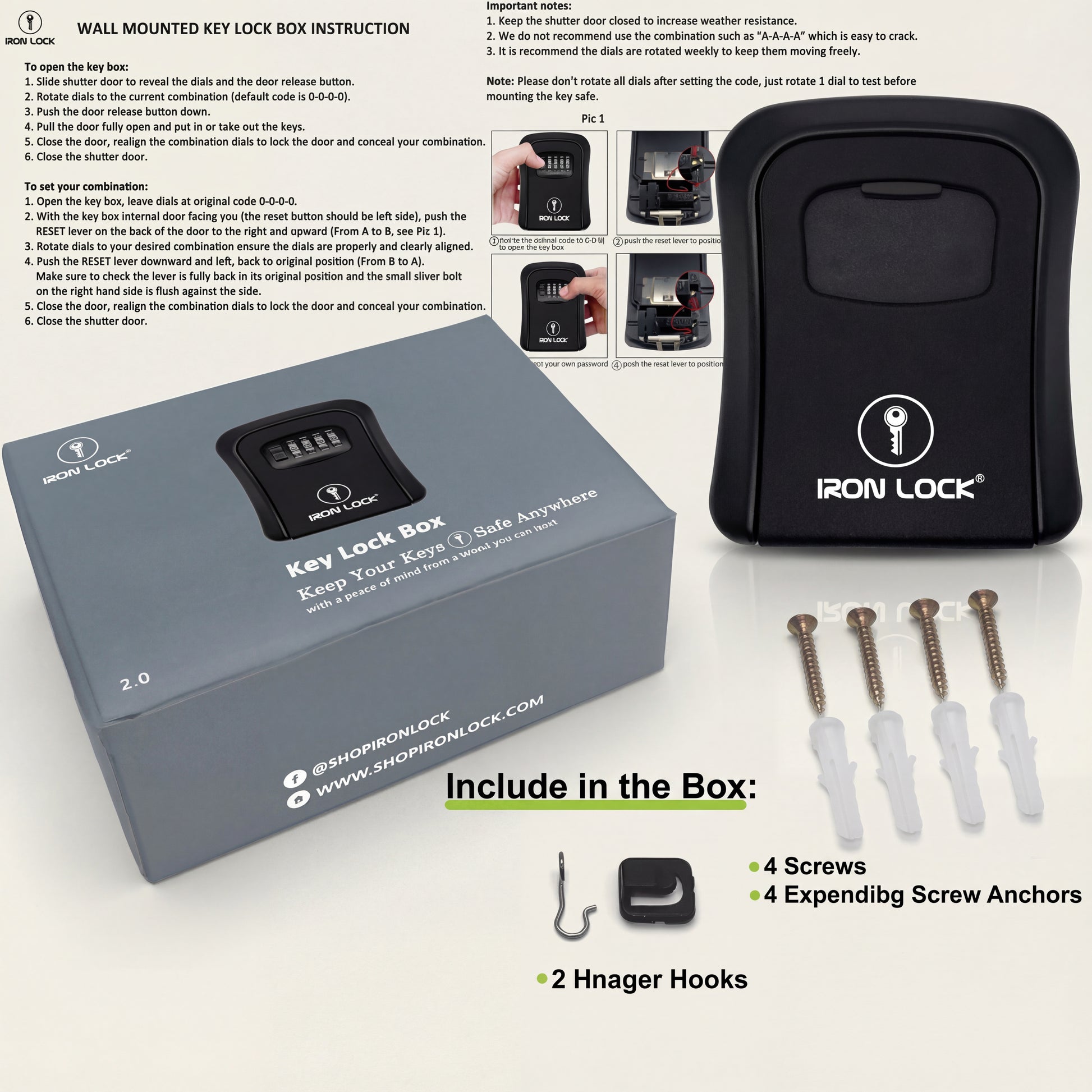 Iron Lock - Key Lock Box, 4 Digit Combination Lock Box, Wall Mounted Key Lock Box, Indoor/Outdoor Waterproof Lock Box, A/B Switch with Resettable Code